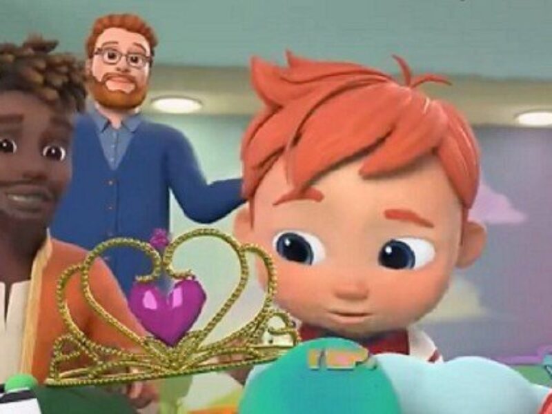 A scene from a controversial song from the Netflix show “CoComelon” shows a boy holding a tiara as his two “dads” look on. A new
