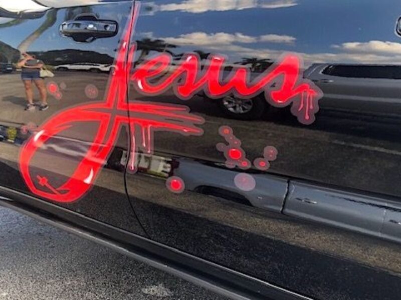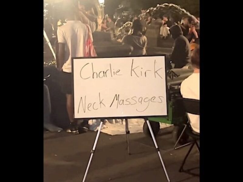 A sign at a Halloween event in Washington Square Park in New York City in October 2025 reads: ‘Charlie Kirk Neck Massages’ A sign at