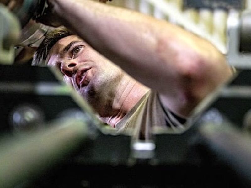 U.S. Air Force Master Sgt. Troy Lawrence inspects a GBU-54 bomb after assembly during Resolute Force Pacific 2025 at Misawa Air Base, Japan, Thursday, Aug.