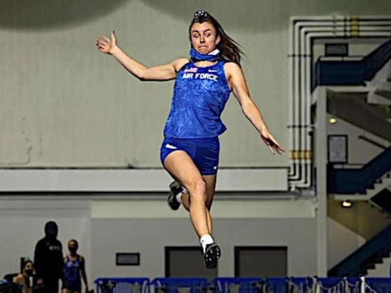 Air Force Cadet 2nd Class Kendra Middleton competes in a long jump during the holiday track-and-field meet at the U.S. Air Force Academy’s Cadet Field