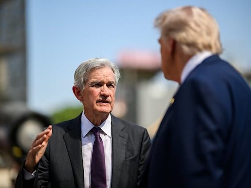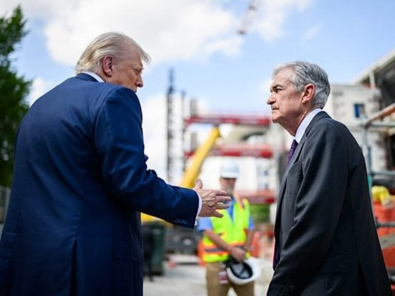 President Donald Trump speaks to Fed Chair Jerome Powell during a tour of the Federal Reserve in Washington, D.C., Thursday, July 24, 2025. (Official White