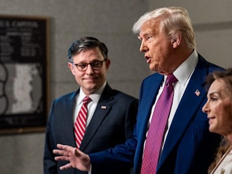 President Donald Trump and Speaker of the House Mike Johnson speak to members of the media at the U.S. Capitol in Washington, D.C., Tuesday, May