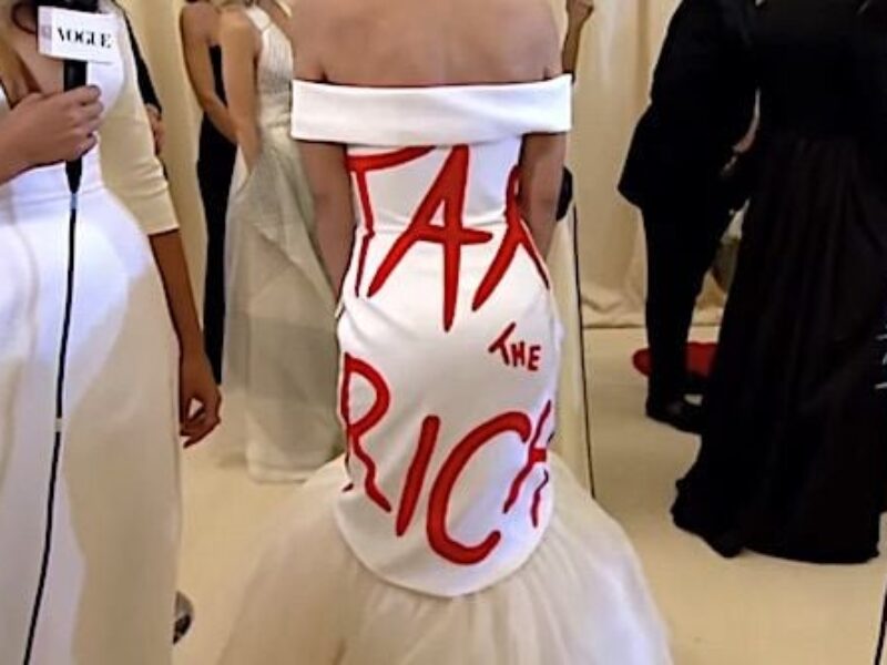 U.S. Rep. Alexandria Ocasio-Cortez, D-N.Y., sports a dress stating ‘Tax the Rich’ at the Met Gala in New York City on Monday, Sept. 13, 2021.