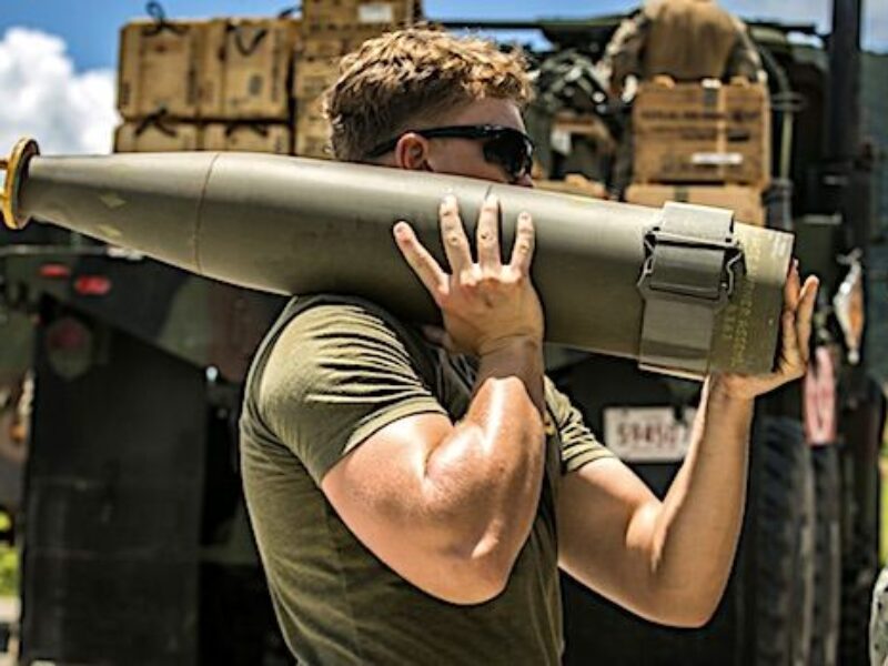 U.S. Marine Corps Cpl. Carter Hughes, a combat engineer from Salt Lake City, Utah, carries a 155mm artillery round while conducting explosive ordnance disposal operations