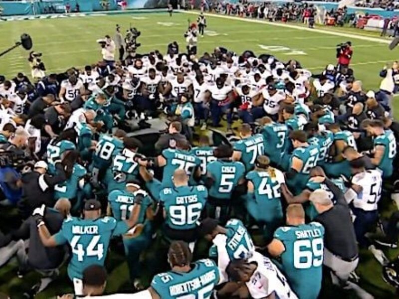 NFL players from the Jacksonville Jaguars and Tennessee Titans pray for Damar Hamlin before their game on Saturday, Jan. 7, 2023. It’s already been 10