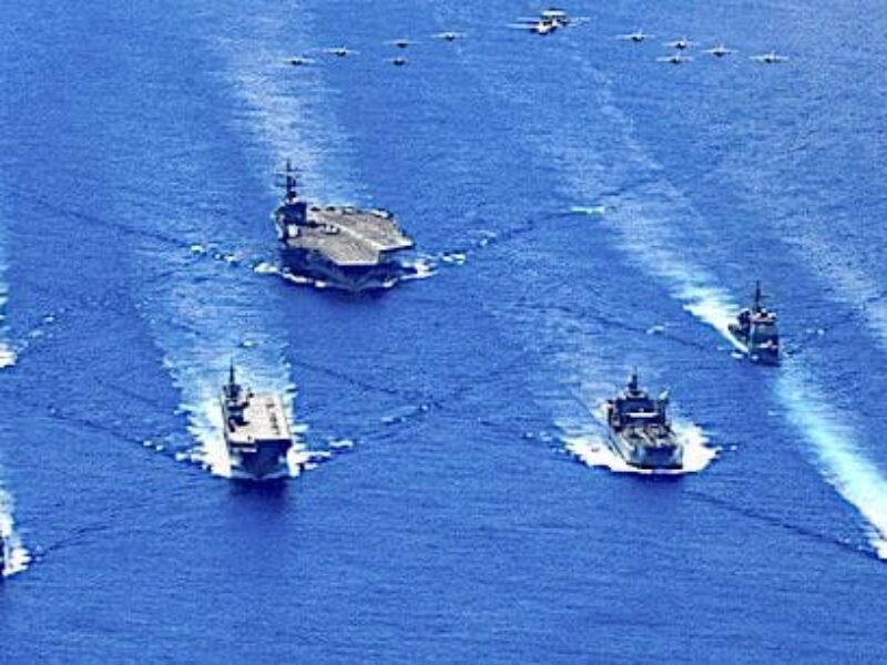 The aircraft carrier USS Ronald Reagan and the guided missile cruiser USS Antietam steam in formation with Australian and Japanese ships during a trilateral security
