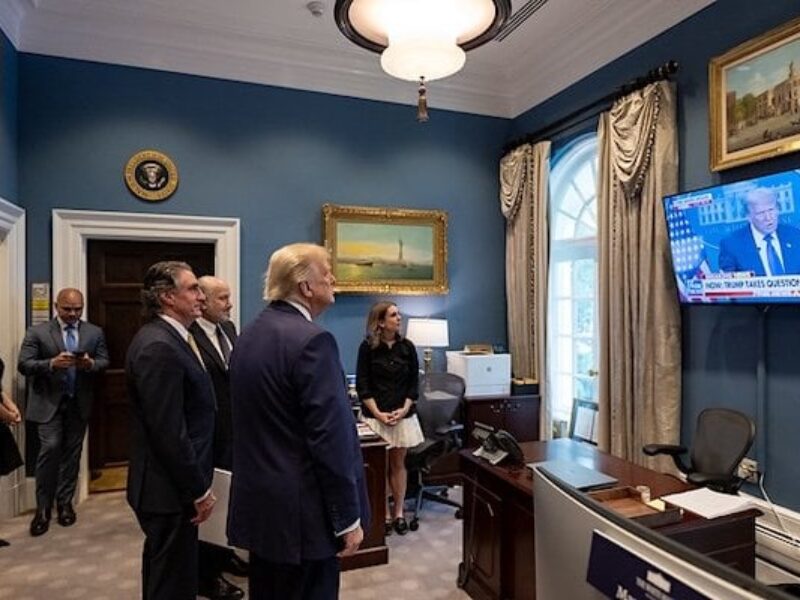 President Donald Trump watches a recap of his press conference in the Outer Oval on Friday, June 27, 2025. (Official White House photo by Molly