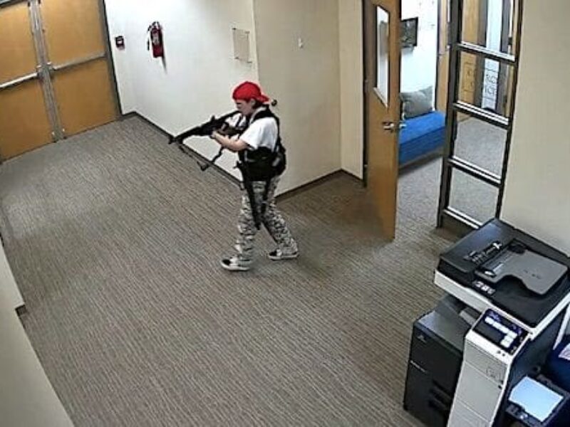 Surveillance video shows Audrey Hale stalking the halls of the Covenant School in Nashville, Tennessee, on Monday, March 27, 2023. A lawsuit over the public’s