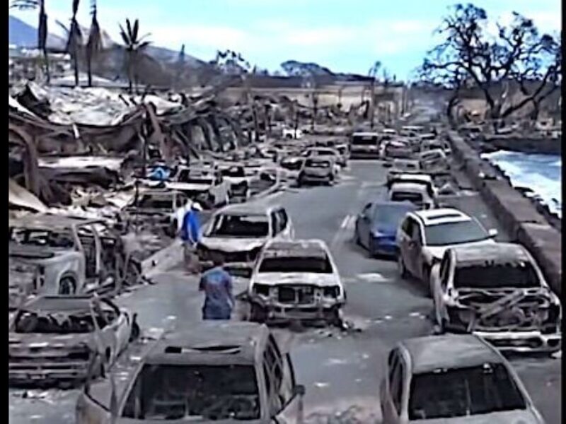 Scorched cars in Lahaina, Hawaii, in the aftermath of devastating wildfires in August 2023. (Video screenshot) The U.S. Department of Homeland Security is calling out