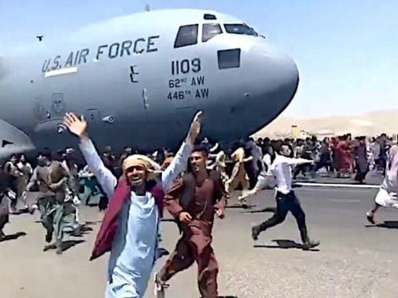 People cling to a U.S. Air Force jet in Kabul, Afghanistan, on Monday, Aug. 16, 2021. Many have called then-President Joe Biden’s August 2021 troop