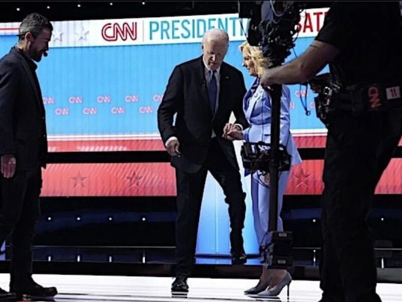 Jill Biden helps Joe Biden off the stage after the first presidential debate in Atlanta on Thursday, June 27, 2024. A longtime Democrat who was