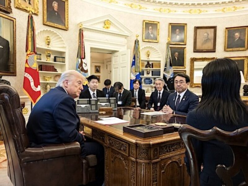President Donald Trump meets with the Japanese Minister of State for Economic and Fiscal Policy Ryosei Akazawa and delegation in the Oval Office, Wednesday, April
